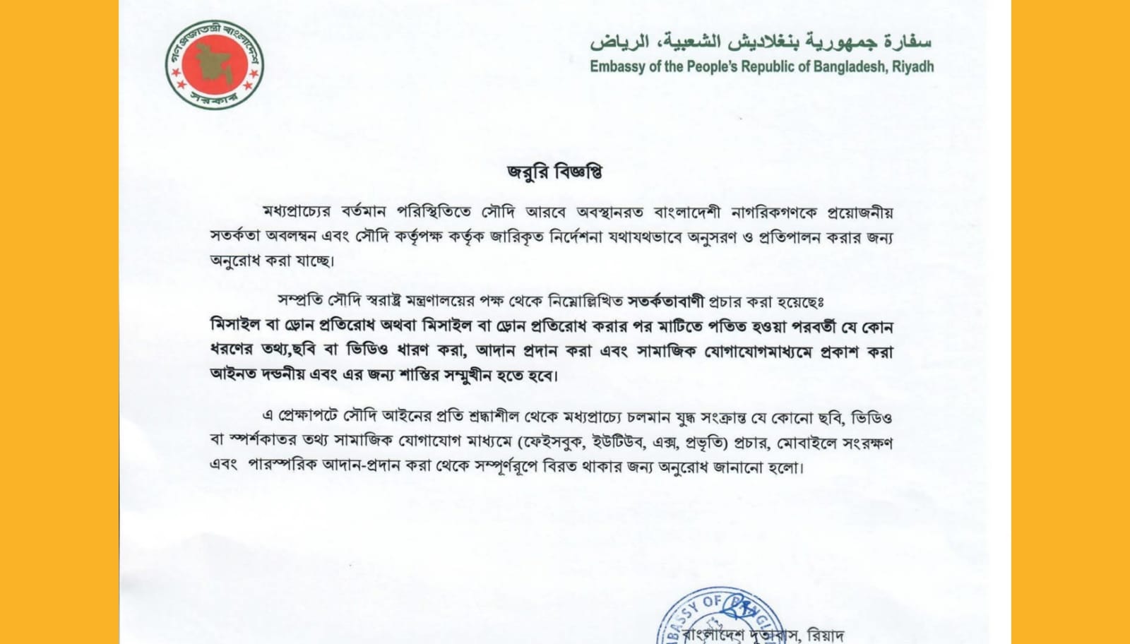 রিমন হোসেন, সৌদি আরব: সৌদি আরবে অবস্থানরত প্রবাসী বাংলাদেশীদের জন্য চলমান যুদ্ধ সংক্রান্ত জরুরি বিজ্ঞপ্তিটি রিয়াদ এম্বাসি বাংলাদেশ ফেইসবুক ভেরিফাইড পেইজ থেকে পাবলিস্ট করা হয়। জরুরি বিজ্ঞপ্তিটি দেওয়া হলো: মধ্যপ্রাচ্যের বর্তমান পরিস্থিতিতে সৌদি আরবে অবস্থানরত বাংলাদেশী নাগরিকগণকে প্রয়োজনীয় সতর্কতা অবলম্বন এবং সৌদি কর্তৃপক্ষ কর্তৃক জারিকৃত নির্দেশনা যথাযথভাবে অনুসরণ ও প্রতিপালন করার বিস্তারিত..