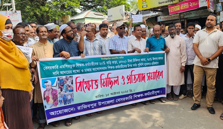 কুড়িগ্রাম জেলার রাজীবপুর উপজেলায় বেসরকারি এমপিওভুক্ত শিক্ষা প্রতিষ্ঠানের শিক্ষক-কর্মচারীদের উদ্যোগে বিক্ষোভ মিছিল ও প্রতিবাদ সমাবেশ অনুষ্ঠিত হয়েছে। বুধবার (১৫ অক্টোবর)